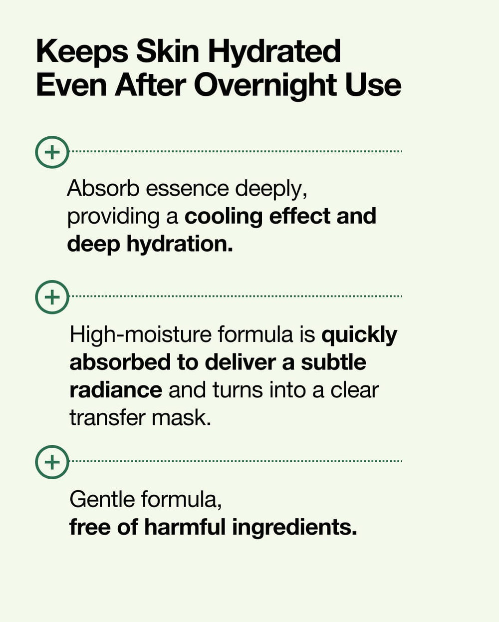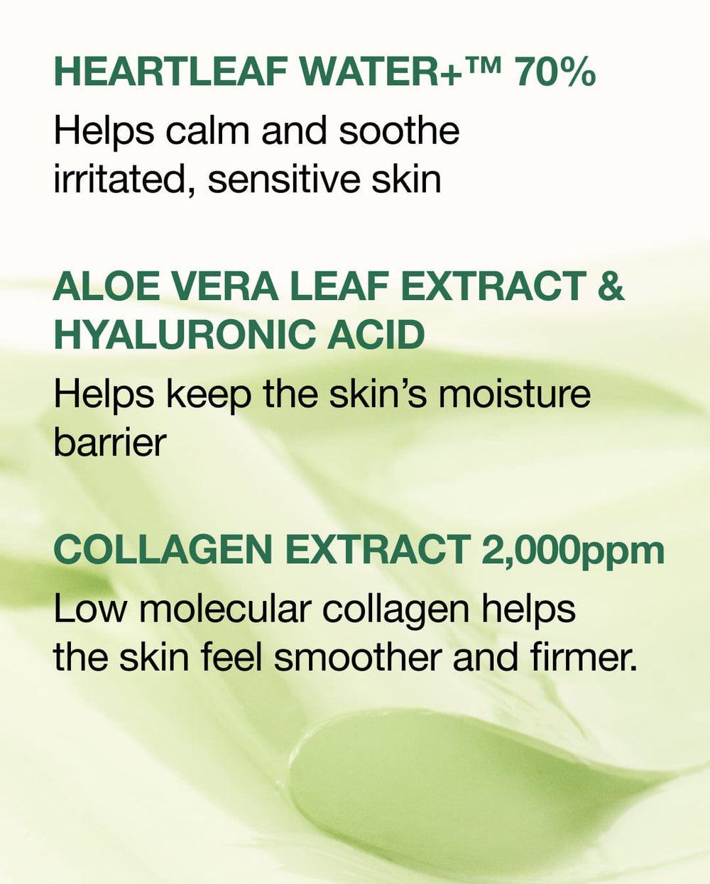 Összetevők: Houttuynia Cordata Flower/Leaf/Stem Water, Water, Butylene Glycol, Glycerin, Hydrogenated Polydecene, 1,2-Hexanediol, Acrylates Copolymer, Ceratonia Siliqua (Carob) Gum, Xanthan Gum, Carrageenan, Hydroxyacetophenone, Sucrose, Allantoin, Potassium Chloride, Cellulose Gum, Sodium Polyacrylate, Dipotassium Glycyrrhizate, Aloe Barbadensis Leaf Extract, Gellan Gum, Caprylyl Glycol, Adenosine, Propanediol, Ethylhexylglycerin, Chromium Oxide Greens (CI 77288), Menthoxypropanediol, Menthyl Lactate, Sodium Phytate, Soluble Collagen, Sodium Hyaluronate, Houttuynia Cordata Extract, Cryptomeria Japonica Leaf Extract, Nelumbo Nucifera Leaf Extract, Saccharomyces Ferment, Hyaluronic Acid, Hydrolyzed Hyaluronic Acid