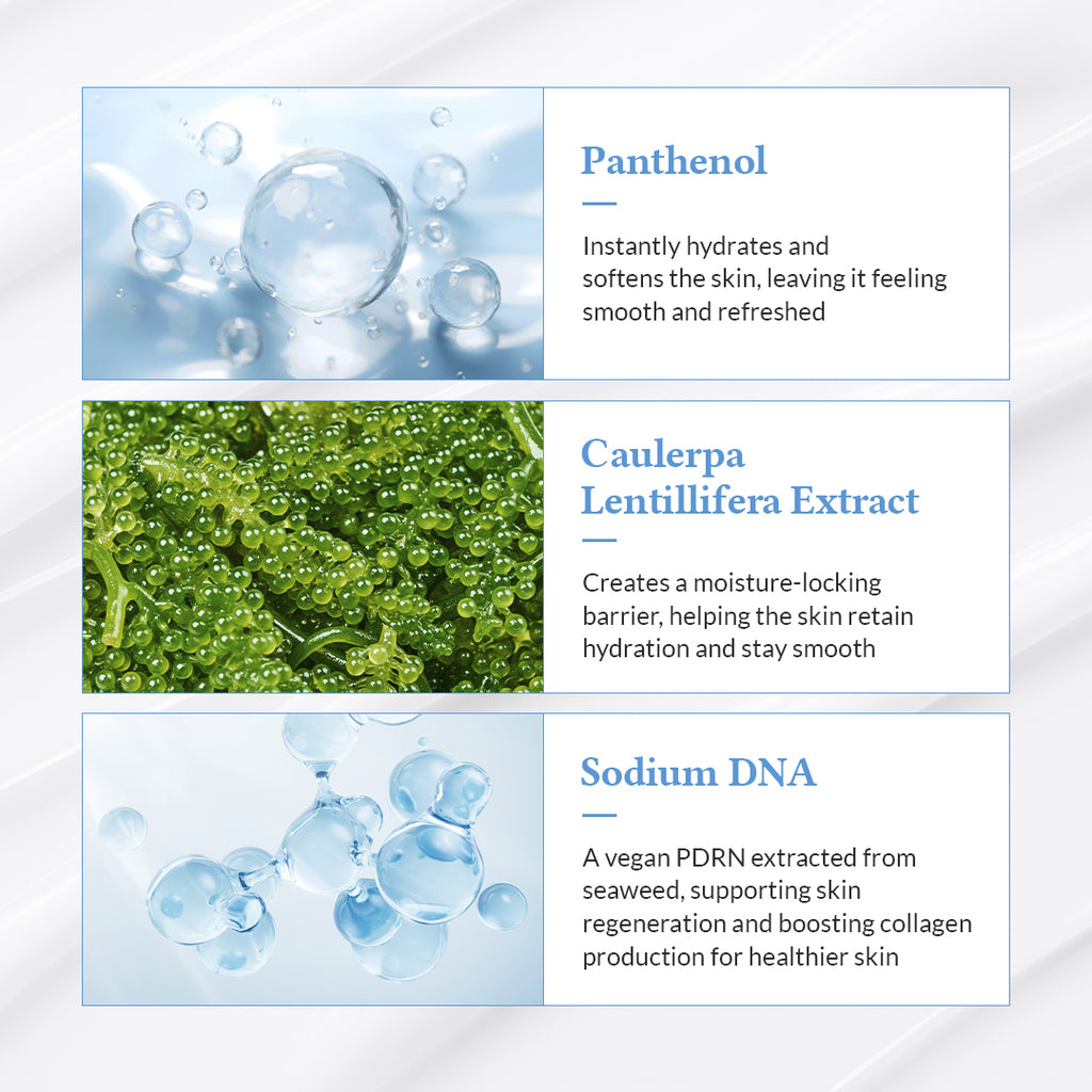 Panthenolt és Caulerpa Lentillifera kivonatot tartalmaz, amelyek hidratálják és simává teszik a bőrt.