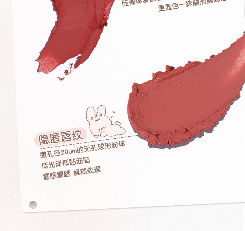 • Könnyű, púderes-matt hatás, ami nem ül be a ráncokba és nem szárítja a szájat.