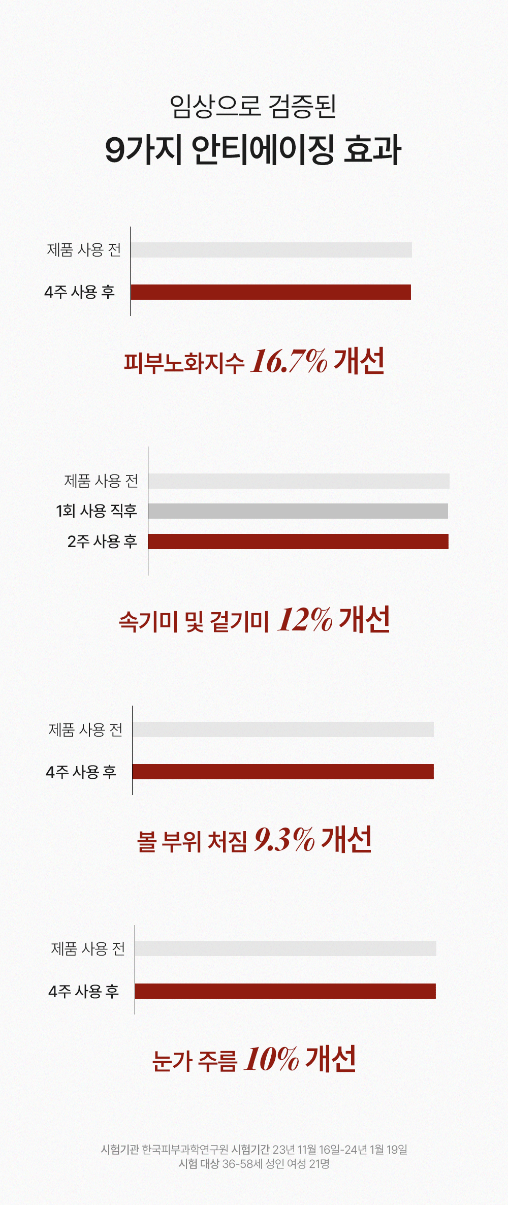Klinikailag tesztelt formula, amely bizonyítottan csökkenti az öregedés látható jeleit, beleértve a ráncokat, a bőr megereszkedését és az öregségi foltokat. Jelentősen javítja a bőr rugalmasságát, miközben hatékonyságát és biztonságosságát klinikai vizsgálatok támasztják alá.