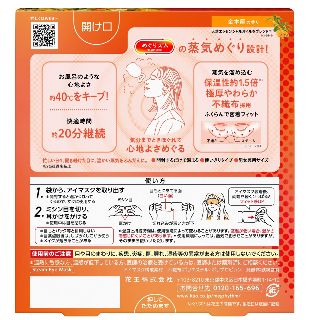 A MegRhythm Steam szemmaszk kellemes 40°C-ra melegszik fel a maszk. Aromaterápiaként Osmethus illatot áraszt. Pihenteti a szemeket és a finom szemkörnyéket. Segít a nap feszültségének oldásában és megnyugtat. Segít egy hosszú nap utáni feltöltődésben, vagy digitális eszközök használata után pihentetni a szemeit. Használhatja utazásánál is. Nehéz elaludni? Próbálja ki a Steam szemmaszkokat, segíthet az ellazulásban. Kb. 10 percig tartja a 40°C hőmérsékletet.